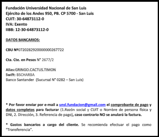 Una vez realizada la transferencia por el importe correspondiente, es indispensable enviar el comprobante de pago al correo electrónico de la Fundación (unsl.fundacion@gmail.com). Este procedimiento debe realizarse cada vez que se realiza un pago.