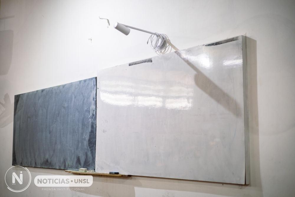 Los espacios también poseen una cámara secundaria fija instalada en una posición elevada que apunta directamente al pizarrón. Su función es permitir que los contenidos escritos o dibujados por el/la docente puedan ser visualizados por los/las estudiantes conectados en línea, garantizando el acceso completo a los recursos utilizados durante la clase.