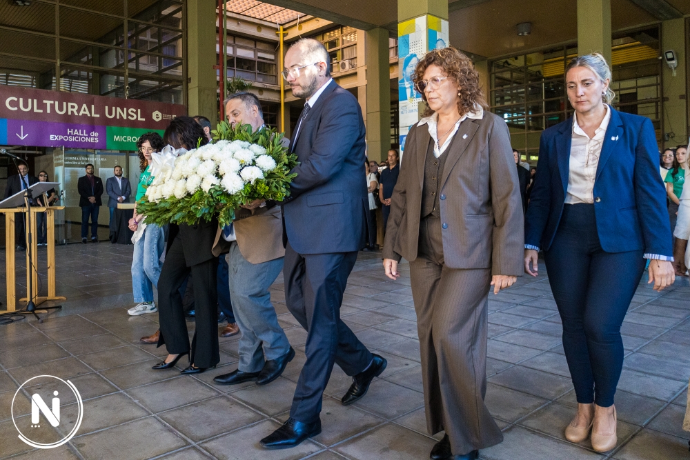 Posteriormente, el rector de la Institución, Dr. Raúl Gil manifestó que al depositar la ofrenda floral ante la figura de nuestro rector desaparecido, Mauricio Amílcar López, ubicada en la explanada que es símbolo de nuestra identidad y de nuestra resistencia, no solo cumplimos con un protocolo de memoria, sino que se renueva el contrato ético que define a la Universidad Nacional de San Luis.